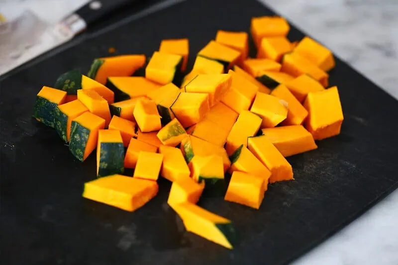 ฟักทองปอกเปลือกและเอาเมล็ดออก KUBET หั่นเป็นชิ้นขนาดประมาณ 1–2 ซม.