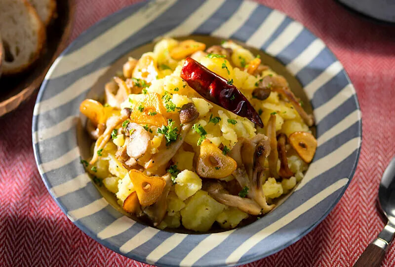 - วัตถุดิบหลัก: มันฝรั่ง, เห็ดหลากชนิด, กระเทียม, เนย, พริกแดง, ผักชีฝรั่ง (ตามชอบ)